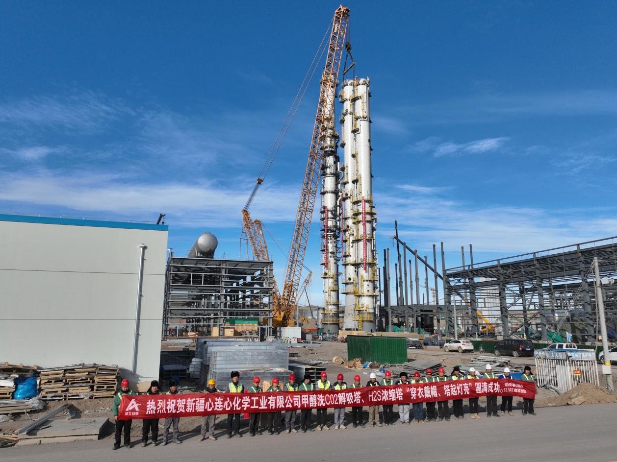 新疆准东甲醇洗工段大型塔器“穿衣戴帽”吊装圆满成功